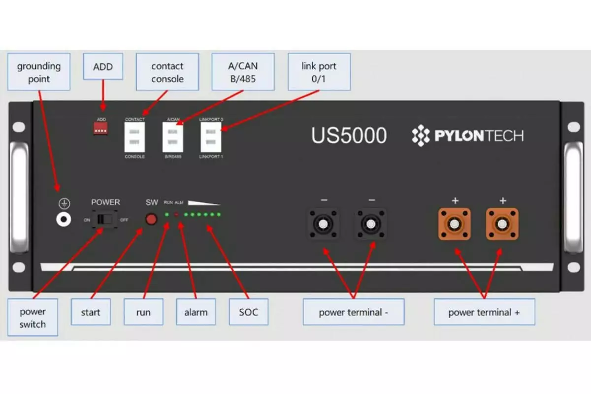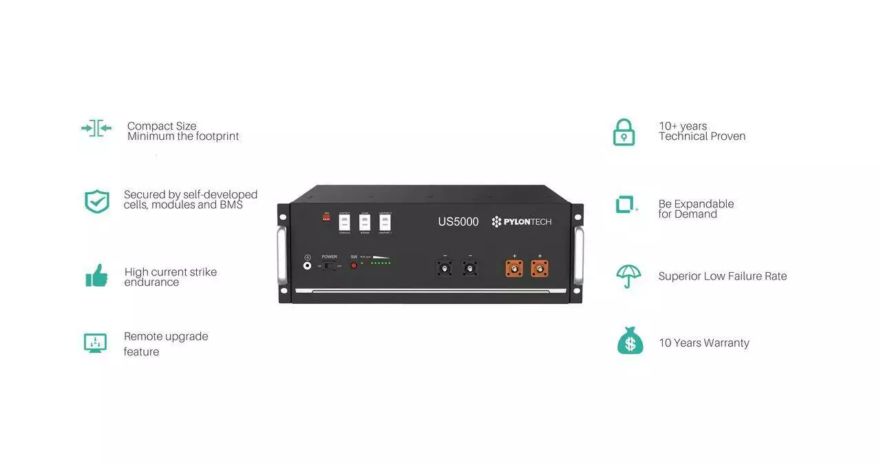 Акумуляторна батарея літій-залізо-фосфатного типу Pylontech US5000 характеризується глибокою ємністю, тривалим терміном експлуатації, великою кількістю циклів заряду-розряду та сучасним практичним дизайном, у кожному модулі встановлена система управління батареями (BMS), що забезпечує більшу безпеку. Буде чудовим варіантом для встановлення в автономних або гібридних сонячних електростанцій, відмінно працює з більшістю інверторів на сучасному ринку. Має систему керування батареями (BMS), встановлену в кожному модулі, і, отже, забезпечує більшу безпеку. Таким чином, внутрішні елементи контролюються та врівноважуються від перенапруги, перерозряду перегріву тощо.