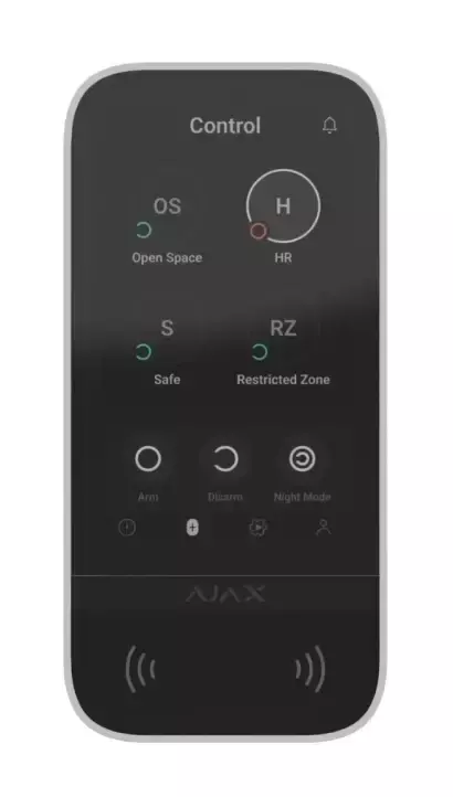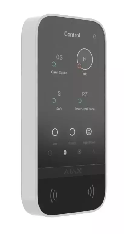 KeyPad TouchScreen обладнана вбудованим зумером, сенсорним дисплеєм і зчитувачем для безконтактної авторизації. Клавіатуру можна використовувати, щоб керувати режимами охорони та пристроями автоматизації, а також повідомляти про тривоги в системі.
