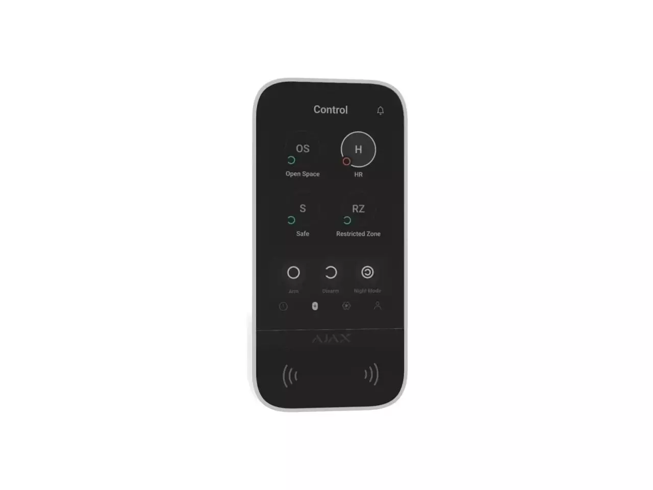 Якщо активовано, логотип світиться червоним кольором постійно або коли система або група охороняється. Індикація KeyPad TouchScreen відтворюється на дисплеї, коли він увімкнений. Вбудований зумер інформує про тривоги, відчиняння дверей і затримки на вхід/вихід.
