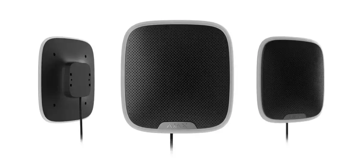 У програмах Ajax можна налаштувати гучність і тривалість сигналу тривоги, а також визначити, які датчики вмикатимуть сирену. Під час тривоги сирена звучить від 3 до 180 секунд із гучністю звуку від 85 до 113 дБ.