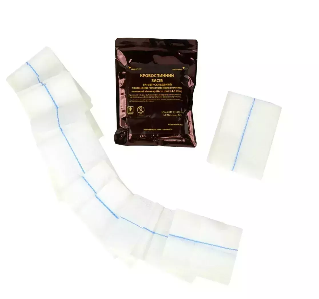 Застосовується для зупинки капілярних, дрібних артеріальних та венозних кровотеч. Складається з щільного нетканого полотна, просоченого гемостатичним розчином на основі хітозану.