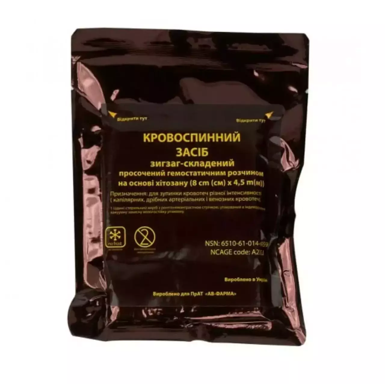 Згідно з міжнародними стандартами додатково оснащений рентгеноконтрастною стрічкою, яка дозволяє знайти засіб при рентгеноконтрастному дослідженні в досить глибокій рваній рані, яка була зашита на місці події. Виріб складено гармошкою для зручного використання у вигляді тампонування, завдяки зигзаг-складеній формі бинт не потребує розмотування. Має компактну, стерильну, вакуумну упаковку, яка має стартові надрізи для полегшення розкриття, що дає змогу швидко затампонувати рану прямо з упаковки.