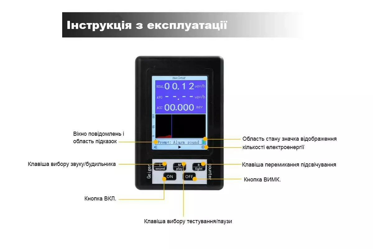 Режими звукової індикації, сигналу тривоги в разі перевищення порога 0,5 мкЗв/год, беззвучний.
