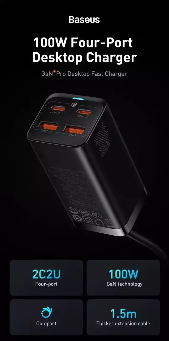 - Універсальний настільний зарядний пристрій з чотирма вихідними портами від Baseus