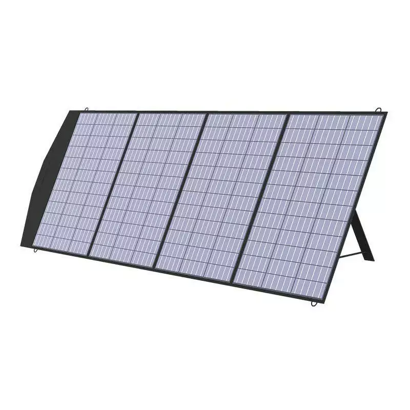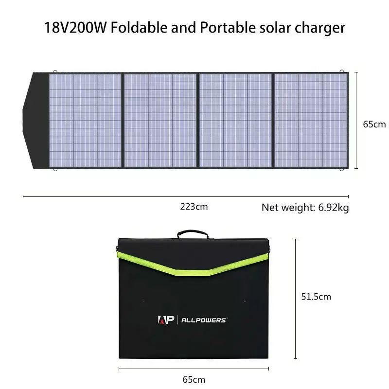 Панель ALLPOWERS 200W складається з 4-х полікристалічних секцій, що відрізняються високим ККД (до 22%). Сонячна панель потужністю 200 Вт оснащена роз'ємами різних розмірів живлення портативних станцій: MC-4 типу Anderson та силовий роз'єм постійного струму. За її допомогою можна жити фірмові електростанції Allpowers або підключати ноутбук. Корпус виготовлений із водонепроникного нейлонового матеріалу, що захищає панель від впливу вологи навіть при прямому попаданні струменя води. За стійкість конструкції відповідає кілька розкладних ніжок, а ряд кілець по периметру дозволяють підвішувати панель зручним для користувача способом. Корпус оснащений зручною ручкою для транспортування.