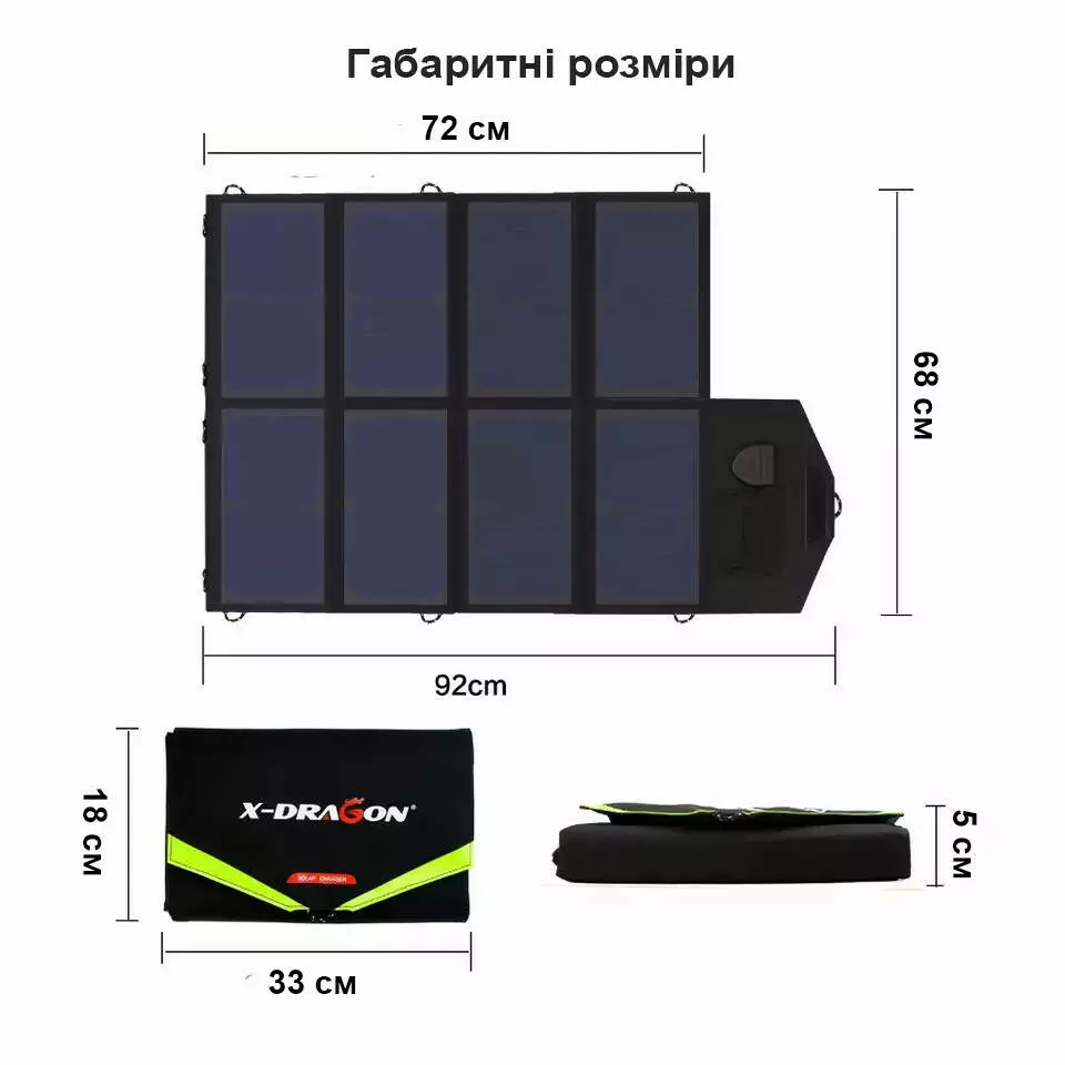 Сонячний зарядний пристрій оснащений автоматичним контролером з інтелектуальною системою управління живленням. Для зарядки пристроїв встановлено 1 порт: USB 5V (для телефонів, планшетів, навігаторів, зовнішніх акумуляторів) і DC (для рацій, нетбуків, ноутбуків, акумуляторів 9-18 вольт).