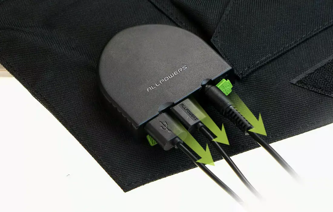 Для заряду Ваших пристроїв сонячна батарея Allpowers 100 Watt оснащена вбудованим контролером з інтелектуальним управлінням і 3 виходами - двома USB (вихідний струм 2.4 Ампера, напруга 5 вольт) і круглим портом DC (вихідний струм 1-5 Ампер, напруга 9-18 вольт). Контролер автоматично регулює подачу струму і напруги залежно від під'єднаного пристрою. Підтримується зарядка вимогливої техніки (iPhone, iPad, Samsung, LG, Xiaomi).