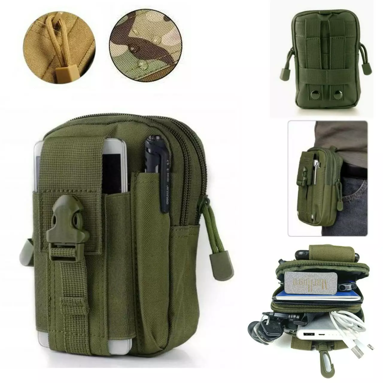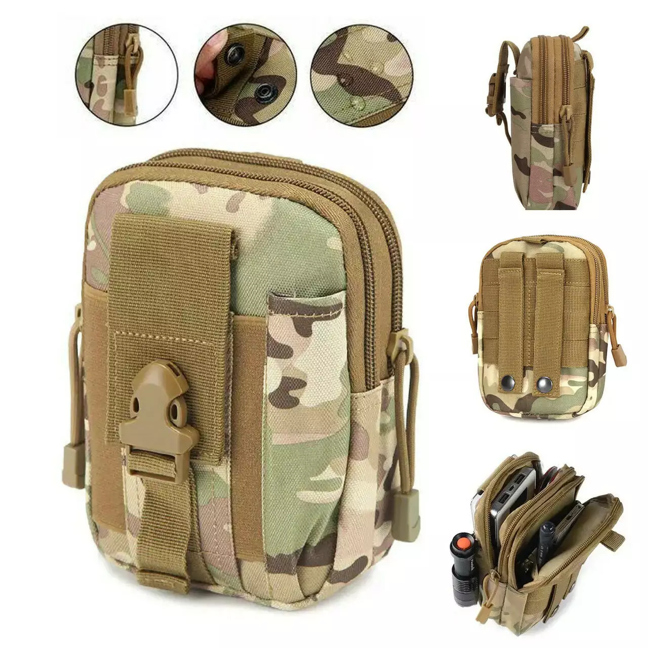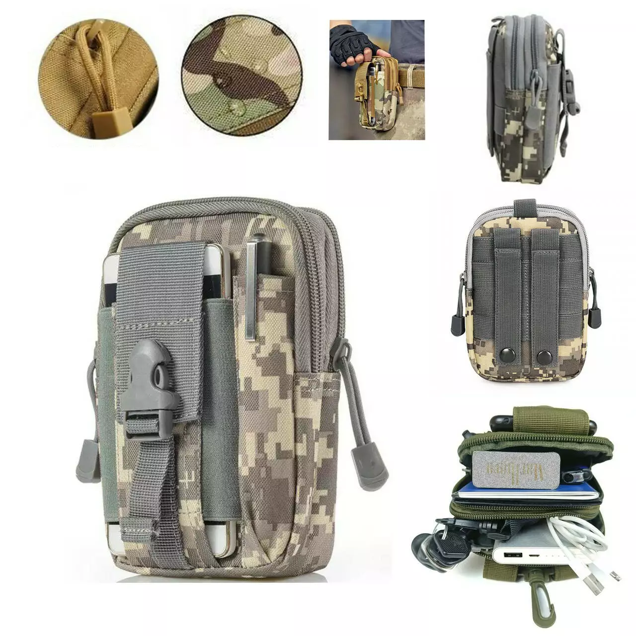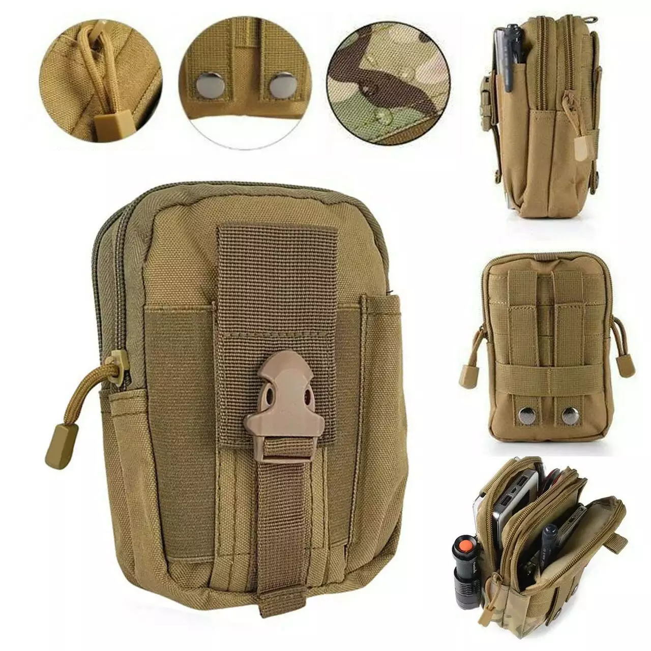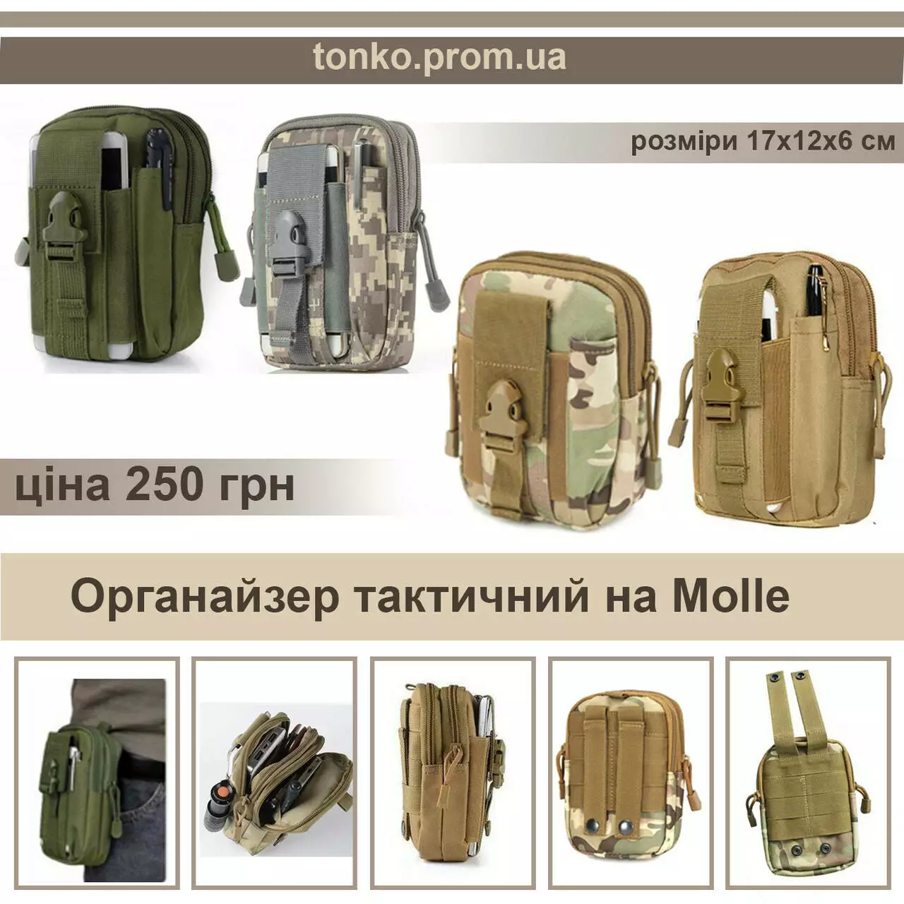 З боків є додаткові кишені для інструментів або ручки. У ньому помістяться всі предмети повсякденного побуту, такі як телефон, ключі або гаманець інші (різні дрібні речі). Підсумок можна прикріпити до ременя, рюкзака або іншого спорядження за допомогою системи кріплення Molle (універсальне кріплення).