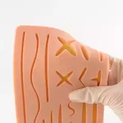 Наша силіконова шовна платформа має 3 окремі шари, що імітують анатомічну структуру людської дерми з ідеальним складом епідермального, фасціального та м'язового шарів. Адгезивні властивості в нижній частині платформи запобігають ковзанню, чіпляючись за стіл, в той час як злегка липка поверхня в верхній частині точно імітує точку контакту шкіра-до-шкіри під час накладання швів. Таким чином, студенти можуть практикувати техніку накладання швів, ніби вони працюють з справжньою шкірою. Реалістичний досвід накладання швів є безцінним для майбутніх лікарів.