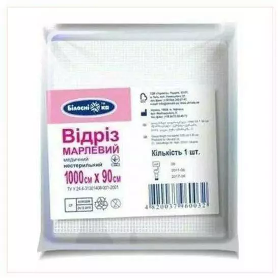 Призначений для використання в медичних цілях. Марлеві відрізи ТМ «Білосніжка» виготовлені із марлі простого плетіння, вибіленої без використання хлору