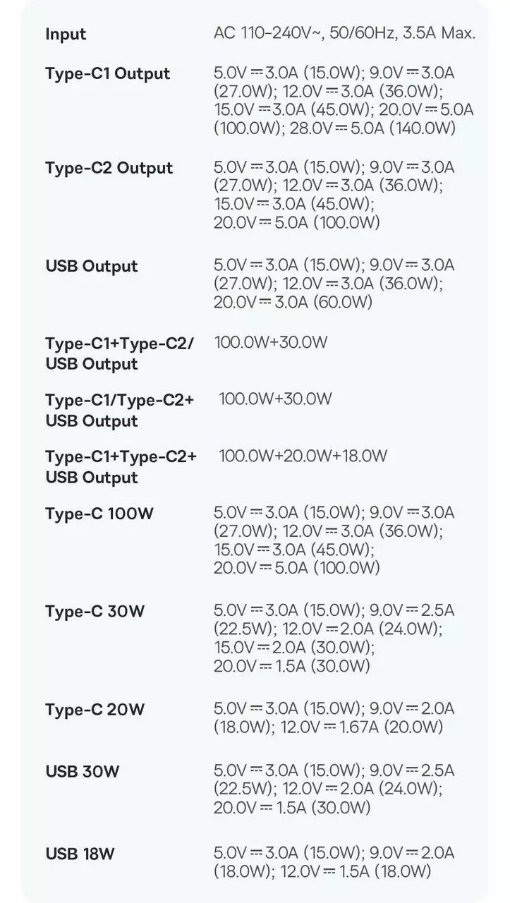 Type-C 100W: 5V/3A; 9V/3A; 12V/3A; 15V/3A; 20V/5A