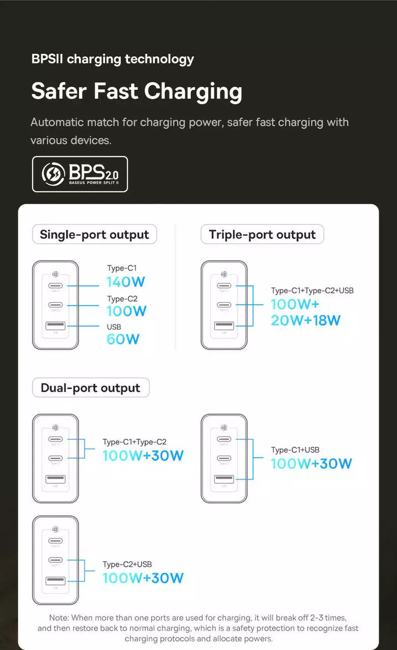 Тип-C1 + Тип-C2 + USB вихід: 100 ВТ + 20 ВТ + 18 ВТ