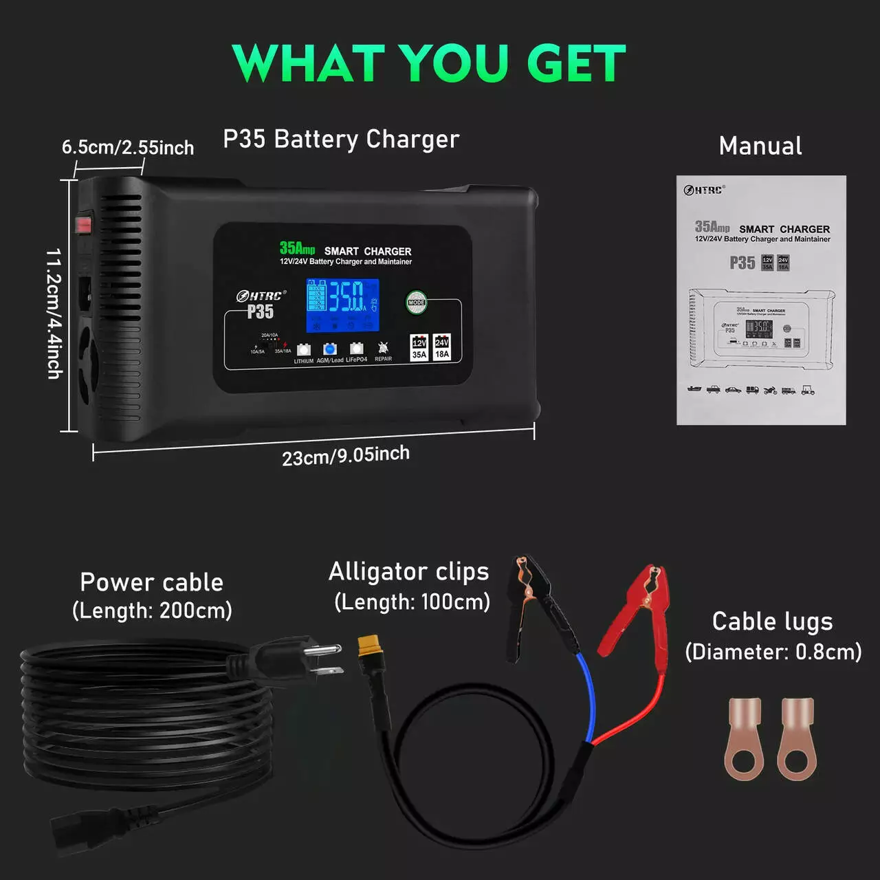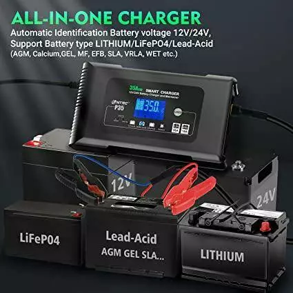 Інтелектуальне автоматичне розпізнавання батареї 12/24 В, швидка зарядка, 12 В 35 А, 24 В 18 А надвисокої потужності, глибокий цикл заряджання батареї, не ушкоджує батарею. Літій, LifePO4, свинцева кислота (AGM/GEL/EFB, MF, затоплена батарея, VRLA, SLA, волога батарея...) Підходить для автомобілів, вантажівок, мотоциклів, позашляховиків, гольф-карів, сільськогосподарських, транспортних засобів, кораблів, моторних човнів і т.д.