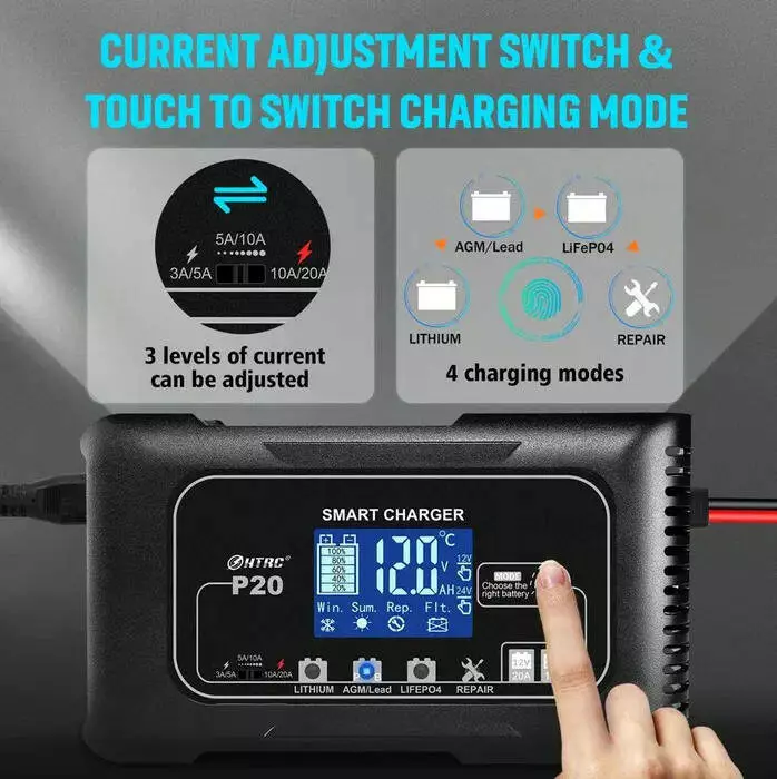 Автоматична ідентифікація акумуляторів 12 В та 24 В без вибору вручну. ЦП інтелектуально контролює процес заряджання. Після повної зарядки він автоматично переходить у режим крапельної зарядки, виявляє сульфатний і кислотний шари та використовує останню функцію імпульсного відновлення для відновлення втраченої акумулятором продуктивності та продовження терміну служби акумулятора. Додатковий струм та тип батареї. Коли заряд батареї дуже низький, максимальний зарядний струм можна інтелектуально відрегулювати до 20 ампер.